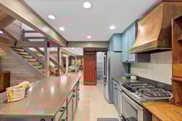 This stunning home features a very spacious living room with soaring ceilings, expansive windows, and a cozy wood-burning fireplace, perfectly positioned adjacent to the dining area—ideal for both everyday living and entertaining. The updated, chef-inspired kitchen showcases a professional-grade range with copper hood, oversized island, walk-in pantry, dedicated eating space, and heated floors. The kitchen dining area opens to a spacious deck and gardens, ideal for gatherings. The main level also includes a generous mudroom with laundry, utility sink, extra refrigerator, nearby ¾ bath, and a comfortable TV room with built-in shelving.